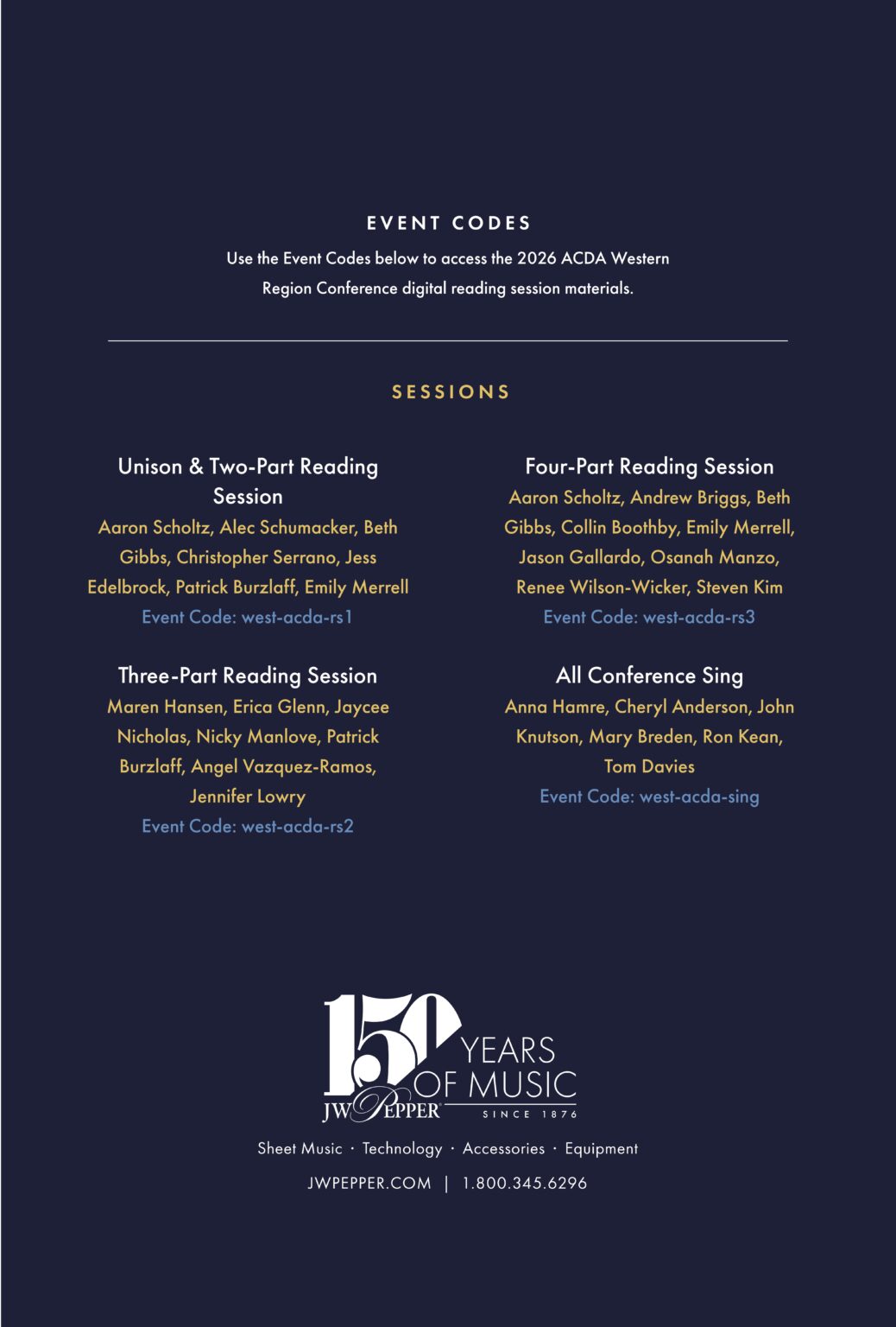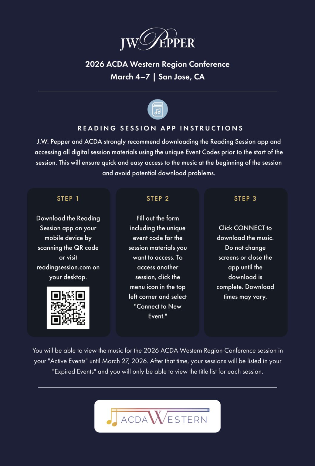 We recommend all attendees download the app prior to the start of the conference. Even if you do not plan to attend a Reading Session, all concerts will begin with a selection from the All Conference Sing.